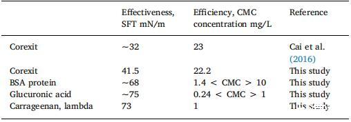 表 2 SFT 和 CMC 比較模型蛋白質(zhì)和酸性多糖。 雖然Corexit 更有效地降低 SFT,EPS 模型成分更有效 因?yàn)樾枰偷枚嗟臐舛炔拍荛_始乳化(蛋白質(zhì))和 穩(wěn)定成分(酸性多糖;結(jié)合大分子并添加 粘度)。
