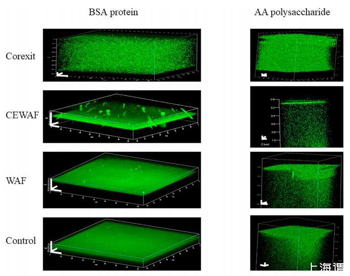 四種治療的共聚焦激光掃描顯微鏡 (CLSM) 帶有模型 EPS 組件的處理如圖 3 所示。 ASW 顯示在左側(cè) BSA 的 0.1% 垂直系列溶液中 右邊是一系列 0.1% 的海藻酸溶液。 橫向, 面板顯示了 Corexit、CEWAF、WAF 的相應(yīng)處理, 和對(duì)照,用于 BSA 和海藻酸溶液。 綠色熒光探針 CTC 突出顯示與陰離子結(jié)合的親水性 Ca2+ 多糖和蛋白質(zhì)的區(qū)域。 對(duì)于海藻酸和 BSA實(shí)驗(yàn),單獨(dú)使用Corexit就可以分散模型分子 無界面積聚。 圖像也顯示出明亮密集 微聚集體中較高傾向的綠色熒光 Corexit 比在其他治療中看到的要多。 海藻酸面板全部顯示 聚集體的分散,而 BSA 面板顯示主要在界面處的蛋白質(zhì)。 CEWAF 海藻酸和 BSA 可以生成 清晰的界面層。 CEWAF 中的 BSA 顯示聚合 當(dāng)它們向上擴(kuò)散時(shí)在垂直方向上被夸大 隨著圖像曝光的時(shí)間。 此外,BSA CEWAF 顯示聚集體似乎在液體表面上方,因?yàn)樗鼈兪?在未顯示的泡沫層之內(nèi)和之上。 具有主要親水部分的控制處理表現(xiàn)出較少的分散 和不太明顯的界面層。 雖然垂直尺度較小 對(duì)于 BSA 圖像比對(duì)于海藻酸圖像,仍然很明顯 海藻酸分散在整個(gè)體積中,而 BSA 迅速擴(kuò)散到界面。 唯一的例外是 Corexit 處理顯示沒有界面積聚和完全分散 海藻酸和BSA。