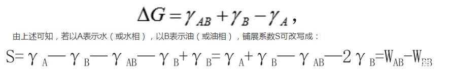 此外黏附功的計算式中γAB為A和B的液液界面張力,關(guān)于這個界面張力的計算,有多重理論,最簡單的一種是Antonoff規(guī)則,該規(guī)則認(rèn)為γAB=γA飽和—γB飽和,式子中γA飽和、γB飽和指的是指的是液體A和液體B相互飽和后的表面張力,而不是其各自的表面張力。