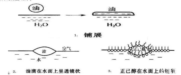 第二種方式,鋪展方式。在上述的液-固界面的潤濕作用,液體在固體表面的鋪展也可以引用到液液界面,不過此時的鋪展過程復(fù)雜一些。比如在清潔的水面上,滴加不溶性“油”滴,此時的“油”在水面上,可能表現(xiàn)出三種不同的狀態(tài):