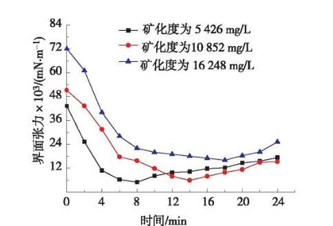 由圖3可知,隨著礦化度的增加,體系的油水界面張力呈現(xiàn)先大幅降低后緩慢增加的趨勢,而且隨著礦化度的增加,體系達到最低界面張力的時間不斷增加。在目標油藏礦化度條件下,體系油水界面張力8 min內(nèi)可達到4.96×10-3mN/m,但當?shù)V化度達到16 278 mg/L時,體系的最低界面張力無法達到10-3級別,主要是由于礦化度過高,破壞了體系的雙電子層。實驗結果表明,該體系在礦化度為5 426 mg/L具有較好的耐鹽性。
