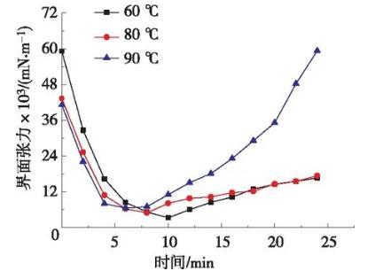 考察不同溫度條件下體系的油水界面張力,評價該體系在油藏溫度條件下的溫度適應性和耐溫性能,實驗結果見圖2。