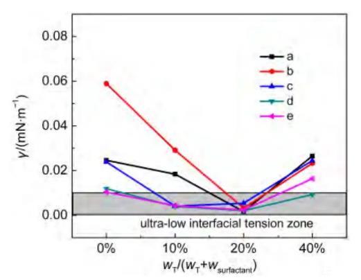 從圖3可見,在所考察的五個油水體系中,界面張力先隨保護劑T的比例增加而下降。當(dāng)保護劑加入量達(dá)到10%-20%(摩爾分?jǐn)?shù))時,即達(dá)到最低界面張力。當(dāng)進一步加入非離子保護劑時,界面張力值反而有所上升。這是因為當(dāng)較少的非離子保護劑加入時,可有效控制陰陽離子表面活性劑混合體系的沉淀,使混合體系的表面活性劑有效濃度增加。而當(dāng)保護劑T比例進一步增加時,陰陽離子表面活性劑的實際總量相應(yīng)減少,使得界面上陰陽離子表面活性劑的實際含量降低。上述實驗結(jié)果充分說明了保護劑的具體作用,即保護劑起到的作用是控制了實際體系中鈣鎂離子對陰陽離子表面活性劑的不利影響,從而獲得了合理的油水兩相表面活性劑濃度的平衡,但是其本身并沒有對超低界面張力的獲得有實質(zhì)性貢獻,是陰陽離子表面活性劑在有效地降低實際油水界面張力。