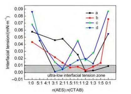 按照陰陽離子表面活性劑:非離子保護劑摩爾比為4:1的比例,在總表面活性劑含量不變的情況下,變化AES/烷基季銨鹽CTAB的混合比例進行研究。實驗結(jié)果顯示,陰陽離子表面活性劑復(fù)配體系的沉淀得到很好的控制,在七中、石西、陸九、莫北四個實際油水體系中獲得了較大范圍的超低界面張力區(qū)間(圖1)。從而證明了我們采用的三組分策略可有效幫助陰陽離子表面活性劑復(fù)配體系實現(xiàn)超低界面張力。