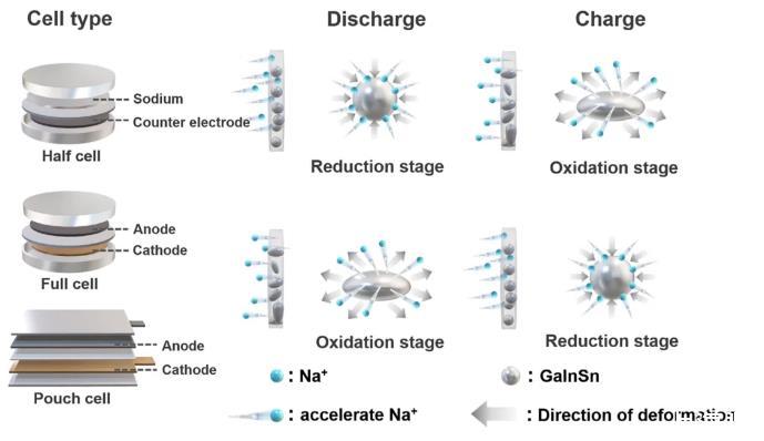該工作闡述了液態(tài)金屬界面張力與電極電勢(shì)之間的關(guān)系,并闡明了電極電勢(shì)對(duì)Na+電化學(xué)傳輸速率的影響(圖1)。在還原反應(yīng)過(guò)程中,電極電勢(shì)降低,液態(tài)金屬的界面張力加快了Na+向內(nèi)的傳輸速率。在氧化反應(yīng)過(guò)程中,電極電勢(shì)增加,液態(tài)金屬表面電荷密度增大,界面張力下降,加快了Na+向外的傳輸速率。在此基礎(chǔ)上,為了加強(qiáng)液態(tài)金屬結(jié)構(gòu)穩(wěn)定性,構(gòu)筑液態(tài)金屬核殼包覆結(jié)構(gòu)(LMNCs),其自調(diào)節(jié)的界面張力有效改善了Na+傳輸動(dòng)力學(xué)過(guò)程。