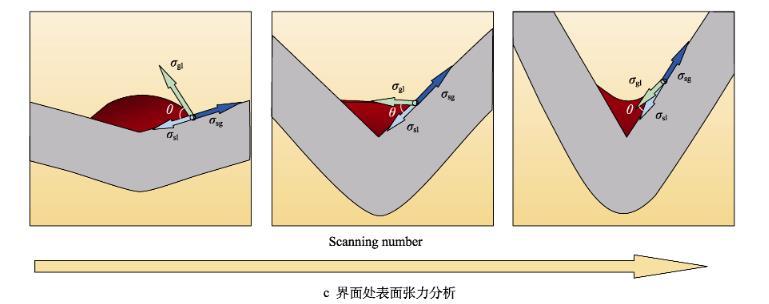 通過(guò)觀察激光熱應(yīng)力成形過(guò)程中彎折處的形貌發(fā)現(xiàn),激光熱輸入、彎曲角度和成形機(jī)制會(huì)影響彎折區(qū)材料表面的擠壓、熔化、流動(dòng)和凝固過(guò)程,以及材料內(nèi)部的溫度梯度和界面表面張力,這些影響導(dǎo)致彎折區(qū)域的輪廓形貌、粗糙度、顯微組織、硬度分布發(fā)生變化。在激光熱應(yīng)力成形過(guò)程中,熔池的受力情況如圖1a所示。一方面,當(dāng)比能較小且熔凝區(qū)僅存在金屬板上表面時(shí),薄板彎折處的增厚主要受到左右兩側(cè)和下側(cè)冷端材料的約束作用,通過(guò)作用于上側(cè)材料,且上表面局部熔化的材料在頂端表面張力的作用下,形成了頂部凸起的形貌。同時(shí),由于激光瞬態(tài)作用時(shí)間較短,熔融材料在激光掃描結(jié)束后快速凝固,并在掃描次數(shù)逐漸增加的過(guò)程中形成連續(xù)隆起的形貌,在彎折處形貌演變過(guò)程中粗糙度逐漸增大。在高比能下,薄板彎折處材料的熔化凝固和塑性變形受到左右兩側(cè)材料的橫向約束,該區(qū)域在左右兩側(cè)材料的擠壓下增厚。