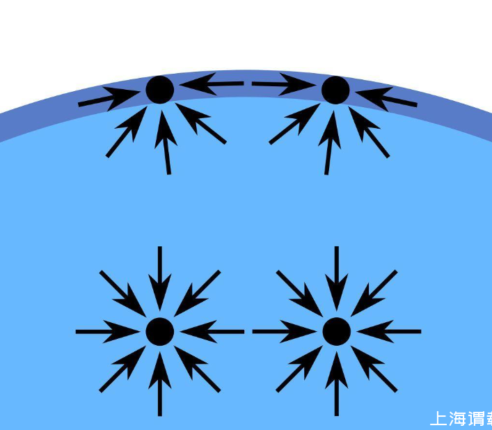 再次,水的表面張力在這里起到了一定的作用。液相與氣相接觸時(shí)會(huì)形成一個(gè)表面層,在這個(gè)表面層上的液體分子受到內(nèi)部液體的吸引力大于外面氣體分子給的吸引力,這些分子就有向液體內(nèi)部聚攏的趨勢(shì),這種趨勢(shì)形成了表面張力。在表面張力的作用下,水面像是一個(gè)緊繃的橡膠膜,如果用手掌去拍沒(méi)有破除表面張力的水面自然就覺(jué)得疼。