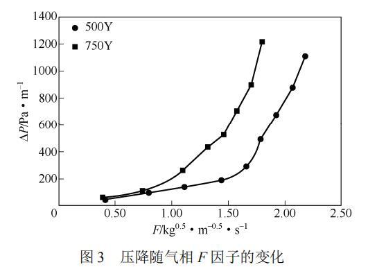 (1)在一定負荷范圍內,750Y填料的分離效率優(yōu)于500Y填料,但單位填料高度的壓降高于500Y填料,導致操作穩(wěn)定性比500Y填料差,處理量比500Y填料小。