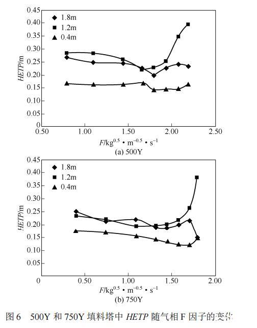 實驗測定了回流量從小到大直至液泛的流體力學性能和傳質性能,得到了液泛時的實驗數(shù)據(jù),給定了操作的極限。圖4(a)為500Y填料塔的全塔傳質效率隨氣相F因子的變化,從圖中可以看出隨F因子的增大,HETP先下降后升高,即填料塔的傳質效率先升高后下降,在氣相F因子為1.8kg0.5/(m0.5·s)附近出現(xiàn)轉折。圖4(b)為750Y填料塔的全塔傳質效率隨氣相F因子的變化,從圖中可以看出隨F因子的增大,HETP變化趨勢與500Y相似,傳質效率先升高后下降,轉折點在F因子等于1.5kg0.5/(m0.5·s)附近。