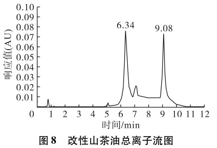 因為AccucoreTMC18色譜柱為非極性毛細管柱,非極性柱的保留作用主要是色散力造成的,其出峰順序一般符合沸點規律,沸點低的先出峰,沸點高的后出峰,所以PEG600單酯先出峰,PEG600雙酯后出峰。通過譜庫檢索發現,6.34 min的峰主要是PEG600單酯,而9.08 min的峰主要是PEG600雙酯,這也說明PEG600和山茶油的水解產物發生了酯化反應且改性山茶油的主要成分是PEG600單、雙酯。