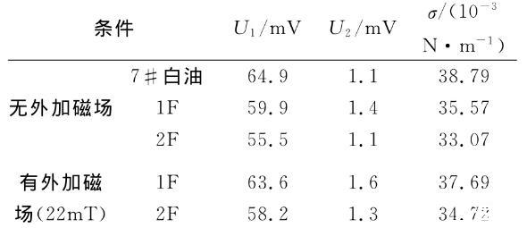 計(jì)算機(jī)實(shí)時(shí)在線采集了2種磁性液體及白油液膜拉脫過程中電壓隨時(shí)間的變化曲線,如圖4所示。從圖4可看到,3種液體的電壓變化規(guī)律一致,圖中F和G兩點(diǎn)是液膜破裂前后瞬間的電壓值,片狀吊環(huán)的內(nèi)外徑分別為33.10mm和34.69mm,根據(jù)(6)式即可計(jì)算出液體的表面張力。室溫(20±0.5)℃時(shí)各液體的表面張力見表2.7#白油的表面張力大于磁性液體,這主要是因?yàn)楸砻婊钚詣┑募尤虢档土艘后w的表面張力。當(dāng)22mT的磁場作用于磁性液體時(shí),磁性液體的表面張力增加,這主要是因?yàn)闊o外加磁場作用時(shí),各磁性顆粒的磁矩方向雜亂無章,互相抵消,磁性液體不顯示宏觀磁性。當(dāng)外加磁場作用于磁性液體時(shí),且磁場方向平行于切線方向的磁性液膜時(shí),各磁性顆粒的磁矩方向轉(zhuǎn)向外加磁場方向,外加磁場增強(qiáng)了磁偶極子之間的相互作用,導(dǎo)致磁性液體的表面張力增加。