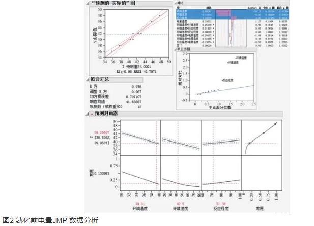 通過JMP分析軟件對正交試驗數據進行分析整理,如圖2所示,建模分析R方為0.976,接近于1,說明正交因素與響應值的擬合度較高;交互作不顯著;通過篩選對比各因素的個體p值,熟化環境溫度的個體p值為8×10-4,熟化環境濕度的個體p值為9×10-4,反應程度的個體p值為0.014,電暈溫度的個體p值為0.196 4,個體p值越小,因素的影響力最大。且從半正態圖也可得出熟化環境溫度為第一影響因素,熟化環境濕度為第二影響因素。因此,熟化前電暈環境溫濕度及電暈影響因素從大到小依次為熟化溫度、熟化濕度、反應程度;電暈溫度影響較小,可忽略。