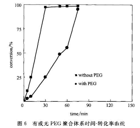 圖6有或無PEG聚合體系時間一轉化率曲線