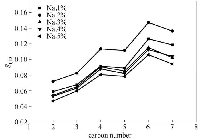 圖8不同Na+濃度下疏水尾鏈碳原子序參數(shù)
