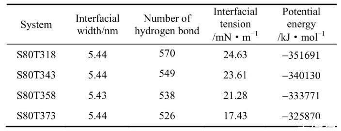 表2通過界面張力、表面活性劑與水的氫鍵數(shù)量、勢能3組數(shù)據(jù)對比得出表面活性劑的界面張力隨著溫度升高而降低的結(jié)論。數(shù)據(jù)表明在4組模擬實(shí)驗(yàn)過程中,界面的寬度并沒有發(fā)生改變。因此界面張力下降的主要原因是由于OPES勢能的降低導(dǎo)致分子之間的作用力也隨之降低。