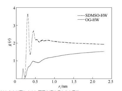 在OPES結(jié)構(gòu)中,有兩個(gè)親水基團(tuán)分別為氧乙烯基(OG)、磺酸基(SDMSO),本文通過徑向分布函數(shù)(通常指的是給定某個(gè)粒子的坐標(biāo),其他粒子在空間的分布概率)來對比兩者與水之間的作用力。圖5為表面活性劑中氧乙烯基和磺酸基與水分子中氫原子的徑向分布函數(shù)、。由圖可知,(r)曲線第1個(gè)峰值出現(xiàn)在0.306處,這表明磺酸基中的氧原子與水g中的氫原子之間較強(qiáng)的氫鍵作用形成了第1水層;在距離為0.458時(shí),出現(xiàn)第2個(gè)峰值,數(shù)值有所下降,這表示逐漸減小的氫鍵作用形成了第2水層;第3水層形成在0.688處,此時(shí)磺酸基與水的作用進(jìn)一步減弱,但3處的峰值均遠(yuǎn)大于氧乙烯基的峰值。這表明磺酸基與水分子的作用力遠(yuǎn)高于氧乙烯基,所以磺酸基為辛基酚聚氧乙烯醚磺酸鹽結(jié)構(gòu)中的主要親水基團(tuán)。