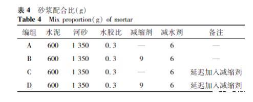 制備四組砂漿,B、D組中的水用SRA按照5%(質(zhì)量分數(shù))進行替換。B組中的SRA與水混合后直接加入水泥中攪拌,A組除不含SRA外與B組一致。而C、D組分兩步混合,C組先只加入95%的水進行攪拌,完成后用塑料薄膜覆蓋攪拌鍋靜置15min,然后加入余下的水以中速攪拌3min,D組與C組唯一不同的地方在于先加入95%的水,最后加入的是余下5%的SRA,具體如表4所示。