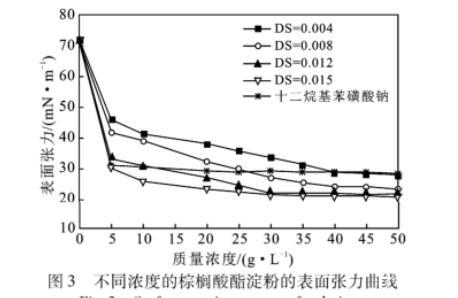 圖3不同濃度的棕櫚酸酯淀粉的表面張力曲線