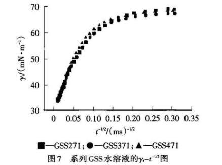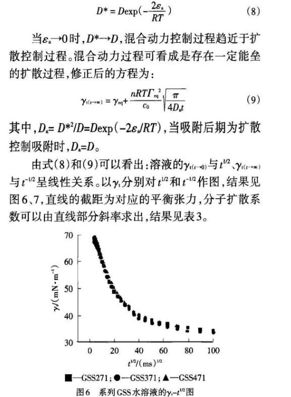 在吸附初期,GSS271的擴散系數最大,表明較容易擴散到次表面,這與在相同濃度下Rosen模型處理的n值最小吻合;在吸附后期,GSS471的擴散系數最大,這與其柔性連接鏈扭曲變形而在表面定向排列緊密相關,且與Rosen模型處理的t*值最大吻合。