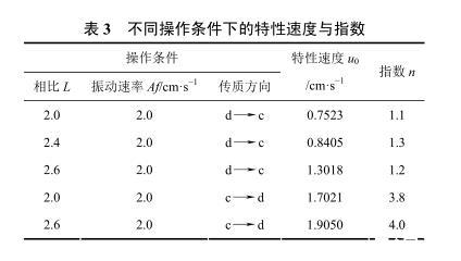 由表3中數(shù)據(jù)可以看出d→c的指數(shù)n在1.2左右,c→d的n在3.9左右,說明指數(shù)只與體系的物性有關(guān),與操作條件無關(guān),傳質(zhì)方向不同導致指數(shù)n不同主要是有機相和水相分別作分散相的緣故。而特性速度與相比有關(guān)。由表3實驗結(jié)果可以看出,正丁醇-丁二酸-水體系的特性速度同時受兩相流速、相比和傳質(zhì)方向的影響,它們都對液滴大小有影響。
