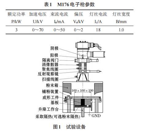 試驗(yàn)設(shè)備為桂林獅達(dá)公司自制的THDW-3型電子束熔粉打印機(jī),電子槍的型號(hào)為M176,電子槍真空度為5×10-2Pa,熔粉成形室注入氦氣之后的真空度為0.3 Pa。電子槍的參數(shù)如表1所示。成形設(shè)備如圖1所示。