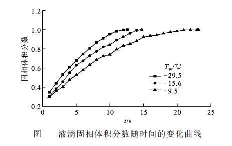 為探究液滴凍結過程所遵循的動力學規律,即固-液相界面推進的動力學規律,擬采用固相體積分數的變化來模擬固-液相界面的推進過程。為了便于液滴固相體積分數的計算,假定液滴始終保持半球狀,通過測量液滴的高度和寬度來確定液滴不同時刻時的固相體積分數,液滴固相體積分數隨時間的變化曲線如圖3所示。在不同冷表面(預設)溫度的條件下,伴隨著液滴的凍結,初期固相體積分數增長迅速,幾乎呈現線性增長趨勢,但隨著時間的推移,增長速率逐漸變緩;通過縱向對比可知,冷表面(預設)溫度越低,固相體積分數的增長速率越快,液滴凍結所需的時間越短。液滴凍結初期固-液相界面推進速度較快一方面是因為銅板的導熱熱阻較小,另一方面則是由于液滴與銅板的接觸面積相對較大,但是隨著時間的推移,冰晶的形成在增加了傳熱熱阻的同時也減小了液相與低溫固相的接觸面積,導致換熱效果變差,固-液相界面推進速度減慢。隨著冷表面(預設)溫度的降低,固-液相界面的推進速度增加,液滴的凍結時間縮短。這是由于冷表面與過冷液滴之間的溫差增大,液滴單位時間內的換熱量增加,導致固-液相界面推進速度增加,液滴凍結時間縮短。