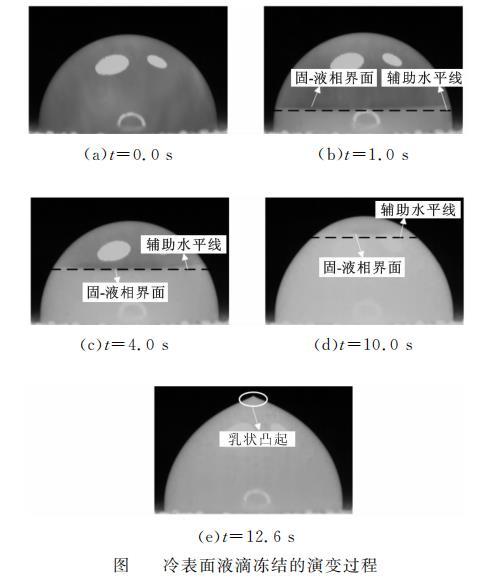 關于液滴在凍結完成后頂部形成乳狀凸起的現象,王皆騰等認為固-液相界面是因為液滴的形狀而呈現出凹曲面的分布特性,而且液滴兩側的凍結速度大于中心區域,這導致液滴的變形出現在液滴頂部。根據晶體生長理論,從界面張力的角度出發,彎曲界面上的界面張力將導致垂直于界面的附加力的出現,使得彎曲界面兩側的壓強不等,即產生界面壓強。這意味著界面張力有使界面面積縮小的傾向,凹曲面會產生向上的附加壓強,促進固-液相界面向上的推移過程,固-液界面為凹面時比平面更加有利于液滴的凝固。由于固-液相界面為凹曲面,在其向上的推移過程中,密度變化引起體積膨脹的效果會在液滴上部液相區不斷累積,表現為液滴高度的增加,最終在表面張力的作用下,液滴頂部會形成明顯的乳狀凸起,如圖2所示。