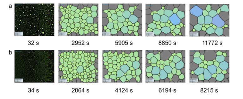 圖5(a)1 g/L C72-MPB和(b)2 g/L C72-MPB表面活性劑溶液從泡沫峰值高度后的不同時間的泡沫形態