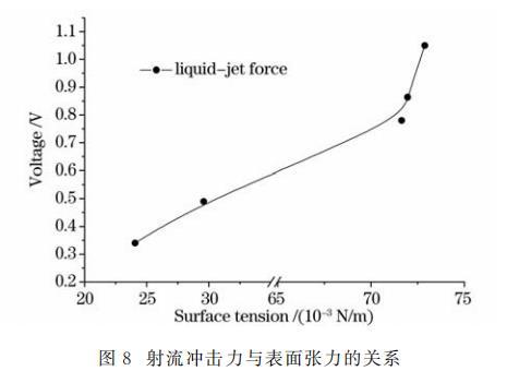 圖8為射流沖擊力隨液體表面張力的變化關(guān)系,從圖可以看出,隨著液體表面張力的增大射流沖擊力也增大;且液體張力越大,靶材受到的射流沖擊強(qiáng)度越大,這是因?yàn)橐后w表面張力加速了空泡的收縮,縮短了空泡潰滅歷時(shí),增加了空泡潰滅速度,所以空泡潰滅時(shí)表面張力所起的加速作用也愈大,其所產(chǎn)生的瞬時(shí)沖擊力也愈大。因射流沖擊力是造成靶材破壞的主要原因,所以張力較大的液體中空泡能產(chǎn)生較大的空蝕效應(yīng)。
