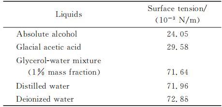 由于本文研究液體張力變化對(duì)固壁面近旁空泡生長(zhǎng)和潰滅過(guò)程的影響,因此所用液體的粘滯系數(shù)μ及密度ρ應(yīng)大體相近,在空氣中的表面張力應(yīng)有較大差異。實(shí)驗(yàn)采用5種液體,其表面張力如表1所示。