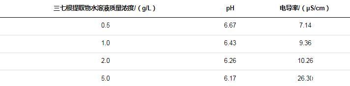 將三七根提取物配制為5 g/L的水溶液并稀釋至各待測濃度,測定其pH值和電導率,結果如表1所示。由表1可知,三七根提取物水溶液呈弱酸性,電導率較低。Russell提出可以使用電導率儀來計算溶液的離子濃度,以此來量化物質(zhì)的離子性強弱。因此,三七根提取物在水溶液中的離子性較弱,屬于一種非離子表面活性劑。