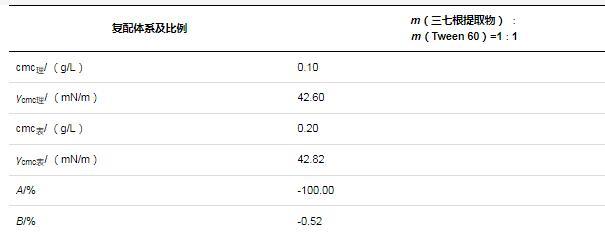 由前文實(shí)驗(yàn)結(jié)果可知,三七根提取物與Tween 60的cmc均為0.1 g/L。根據(jù)2.3.2中方法,確定了三七根提取物與Tween 60復(fù)配質(zhì)量比為1∶1。在25℃下,復(fù)配體系理論值和表觀值如表3所示。三七根提取物與Tween 60的復(fù)配體系形成膠束的能力減效100%,降低溶液表面張力的能力減效0.51%。結(jié)果表明,三七根提取物與Tween 60按1∶1質(zhì)量比復(fù)配后,并不能對體系產(chǎn)生明顯的協(xié)同增效作用,這可能與三七根提取物和Tween 60的含量、結(jié)構(gòu)有關(guān)。