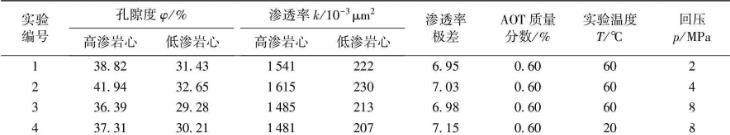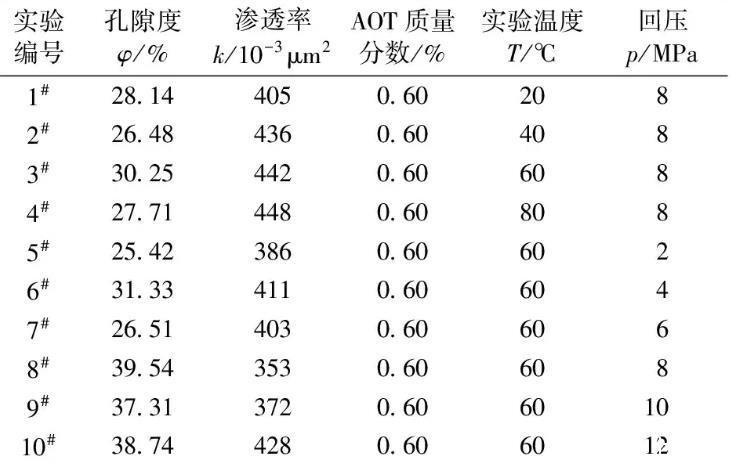 主要實(shí)驗(yàn)材料:選用2-(2-乙基己基)-磺酸琥珀酸鈉(AOT)為表面活性劑;實(shí)驗(yàn)用CO2純度為99.9%;實(shí)驗(yàn)用水為蒸餾水;實(shí)驗(yàn)巖心為填砂管模型,規(guī)格參數(shù):600 mm×Φ25 mm。表1、2所給出的回壓值即為巖心中流體所處的最低壓力,只有高于該回壓值,流體才可以流動(dòng)。