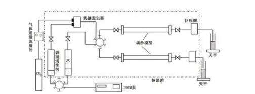 實(shí)驗(yàn)步驟:①利用不同目數(shù)的石英砂填制滲透率約為400×10-3μm2的填砂管模型,初測(cè)氣測(cè)滲透率,滿足要求后測(cè)定水測(cè)滲透率,測(cè)定滲透率為(350~450)×10-3μm2時(shí)合格,可進(jìn)行下一步實(shí)驗(yàn),稱(chēng)取巖心管干重M0;②利用真空泵對(duì)填砂管抽真空3 h,飽和水后稱(chēng)取巖心管濕重M1,則孔隙體積V=(M1-M0)/ρW;③按照?qǐng)D2所示流程圖連接實(shí)驗(yàn)裝置,并依據(jù)實(shí)驗(yàn)方案設(shè)定恒溫箱溫度,恒溫4 h;④依據(jù)實(shí)驗(yàn)方案設(shè)定回壓,水驅(qū)時(shí)速度設(shè)定為1.5 mL/min,CO2乳液驅(qū)時(shí)表面活性劑水溶液及CO2注入速度分別設(shè)定為0.5和1 mL/min,即設(shè)定氣液比為2∶1;⑤實(shí)驗(yàn)過(guò)程中記錄注入端壓力變化;⑥并聯(lián)巖心驅(qū)替實(shí)驗(yàn)與單巖心驅(qū)替實(shí)驗(yàn)類(lèi)似,總流量設(shè)定為5 mL/min。