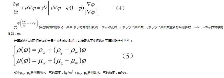 式描述相界面的移動,其中表示時間的積累項,表示對流項,φ表示水平集函數;γ表示水平集函數重新初始化參數,m/s;ε表示界面厚度參數,m。