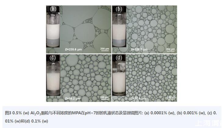 體系成份的濃度對乳液的外觀及粒徑有很大影響。圖3為固定0.5%(w)Al2O3顆粒濃度不變,研究在pH=7時(shí)不同MPA濃度對Pickering乳液的影響。隨著MPA濃度的不斷增加【0.0001%——0.1%(w)】,乳液下層析出的水相逐漸變澄清,說明MPA濃度增加,更多的Al2O3顆粒與MPA分子發(fā)生靜電相互作用,修飾后的Al2O3顆粒更容易從水相層中轉(zhuǎn)移到乳化層中,吸附在油水界面處,并且乳化層的高度也隨著MPA濃度的增加而升高,也說明更多的活性Al2O3顆粒參與乳化。乳液液滴粒徑隨濃度增加逐漸減小,從235.6μm降低到32.5μm,這是因?yàn)橛退缑嫣幍幕钚訟l2O3顆粒的量逐漸增多,可以穩(wěn)定更多的Pickering乳液液滴。