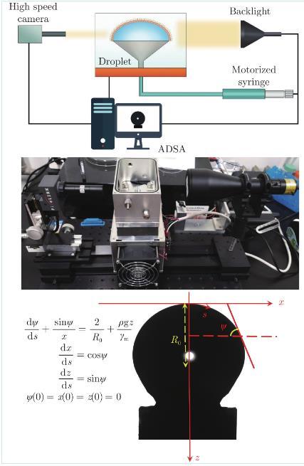 采用課題組自主研發(fā)的約束液滴表面測量儀(Constrained Drop Surfactometry,CDS)測量膜在不同密度下的表面張力,如圖1所示,圖中x與z分別代表水平與豎直方向,s代表液滴表面切向方向,ψ為液滴表面與水平方向內(nèi)夾角,R0為液滴半徑,ρ為液滴密度,g為重力加速度。CDS上的圓形基座用于盛放純水液滴(約10μL),以微量進(jìn)樣針將稀釋的固爾蘇–氯仿溶液滴定到液滴表面,形成形狀類似于肺泡的水?氣界面固爾蘇肺表面活性劑膜。基座中央的小孔通過導(dǎo)管與注射器相連,注/抽水速度由Labview編程的推進(jìn)器控制,以此調(diào)節(jié)液滴表面積的變化速率。實驗測量的是膜在壓縮過程中表面張力與膜密度變化的關(guān)系,液滴表面積以0.05的準(zhǔn)靜態(tài)速率縮小。液滴的輪廓由照相機(jī)拍攝。膜表面張力和表面積以ADSA(Axisymmetric Drop Shape Analysis)方法分析得出。膜表面壓強(qiáng),其中,純水表面張力。