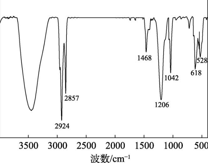 圖1為TAC的FTIR譜圖。從圖1可以看出,2924 cm–1處為主鏈甲基的C—H鍵的伸縮振動吸收峰;2857 cm–1處為主鏈亞甲基C—H鍵的伸縮振動吸收峰;1468 cm–1處為甲基和亞甲基C—H鍵的面內搖擺振動吸收峰;1206 cm–1為磺酸基團中C—S鍵的不對稱伸縮振動吸收峰;1042 cm–1處為胺基C—N鍵的面內彎曲振動吸收峰,表明TAC結構中存在季銨基。618和528 cm–1處為—SO 3-的中強吸收峰,表明TAC結構中存在磺酸基。上述結果表明,TAC符合預先設計的結構。