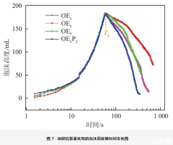 起泡性和穩泡性是表面活性劑泡沫性的兩個非常重要的特征。圖7是0.01 mol/L油醇烷氧基化物水溶液在氣體流量為150 L/min時測量的泡沫衰減曲線。圖中的T0為停止通氣時間,可用此時的泡沫高度表示表面活性劑的起泡性,此后泡沫開始排液并發生衰減。從圖中可以看出,4種油醇烷氧基化物在60 s時的泡沫高度基本都為183 mm,說明4種烷氧基化物的起泡性基本一致。在停止通氣后,油醇烷氧基化物的泡沫高度迅速降低,并沒有經過一個泡沫高度維持不變的時間段,說明此時泡沫不僅開始排液并且發生了坍塌,油醇烷氧基化物的泡沫不穩定。從圖中還可以看出,OEn中泡沫衰減速度為:OE3>OE7>OE5,在255 s后,OE3和OE7的泡沫衰減速度幾乎一致。而OE3P3的泡沫衰減速度最快,這可能是因為PO的支化結構使得液膜的強度較差所致。