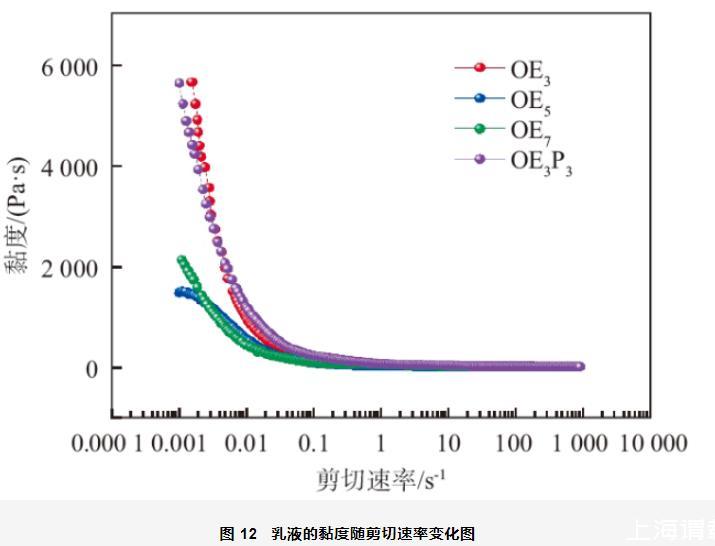 4)以4種油醇烷氧基化物為乳化劑制備的乳液都形成了層狀液晶,流變性測試結果表明4種乳液都屬于剪切變稀體系且加入OE3的乳液體系具有較好的穩定性。