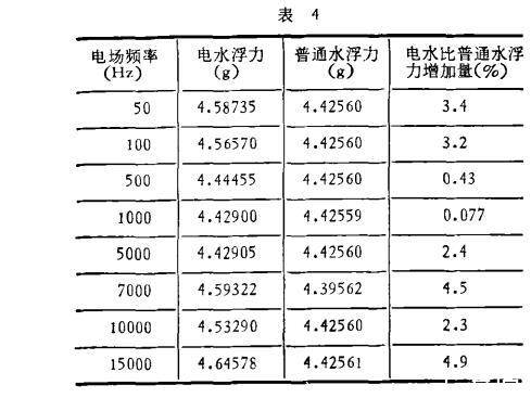 實驗用的振蕩穩(wěn)壓源是上海華東電子儀器廠制造的,輸出功率75W,該電源的電壓在實驗時保持300V、600V和700V三個數(shù)值。改變頻率從0到15kHz,水流過電場的速度為0.16m/s,水溫12.0±0.3℃,用長春市自來水和地下深井水。電水形成后20分鐘開始測浮力。測試時間為1984年10月18日到1984年10月21日,重復(fù)性實驗進行六次,曲線都帶有極值。表4是在電壓600V下的一組數(shù)據(jù)。