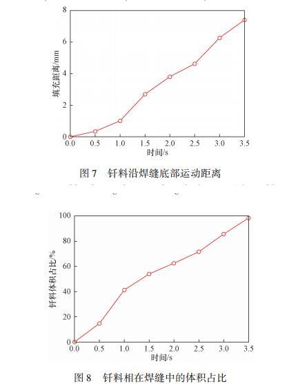液態(tài)釬料沿著焊縫下表面的填充距離如圖7所示。前1s內(nèi),釬料未潤濕焊縫下表面,曲線上表示為釬料豎直向下運(yùn)動的距離,此時鋪展速度較為緩慢。當(dāng)釬料直接接觸焊縫下表面時,驅(qū)動力增強(qiáng),加速了釬料的鋪展。焊接過程中可能會出現(xiàn)微小氣泡從而影響焊接強(qiáng)度,故統(tǒng)計了焊縫內(nèi)不同時刻下釬料體積占總體積的比值(圖8)。在t=1s之前,前沿流動速度較小,但由于填充截面面積較大,總體鋪展速度仍處于較高的水平。當(dāng)釬料開始向兩側(cè)流動,鋪展速度略微下降。最終得到的釬料填充體積占比達(dá)到98.5%,表明焊縫填充效果良好。