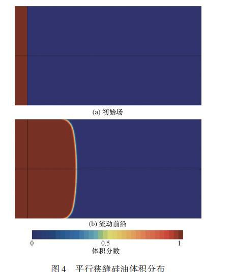 根據(jù)式(6)與式(7)可以看出,這類由表面張力驅(qū)動的流動與邊界處接觸角緊密相關(guān)。為保證接觸角施加方法的正確性,對表面張力驅(qū)動下的平行平板流動進(jìn)行了計算,并將結(jié)果與前人的數(shù)值模擬結(jié)果進(jìn)行了對比。驗證模型為15mm×8mm×0.4mm的平行平板,所采用材料為硅油,具體物性參數(shù)如表1所示。首先將平板前端部分區(qū)域內(nèi)充滿硅油,以此為初始場進(jìn)行計算[圖4(a)]。圖4(b)為計算一段時間后得到的流動前沿,最終得到的前沿最大高度隨時間變化如圖5所示,計算結(jié)果與前人數(shù)值模擬結(jié)果及Washburn解析模型吻合良好,證明了基于VOF模型的數(shù)值方法計算硅油填充平板過程的準(zhǔn)確性。