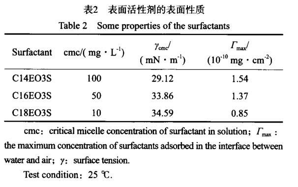 表面活性劑分子的結(jié)構(gòu)特點(diǎn)決定了其在水溶液界面(液-氣)上的吸附特性,其極性基團(tuán)指向水、非極性基團(tuán)則指向氣。應(yīng)用Gibbs公式可計(jì)算表面活性劑在單位溶液表面的最大飽和吸附量(Γmax),表面活性劑的表面性質(zhì)見表2。由表2可見,C14EO3S,C16EO3S,C18EO3S表面活性劑在蒸餾水中的cmc分別為100,50,10 mg/L,對(duì)應(yīng)的γcmc分別為29.12,33.86,34.59 mN/m。由此可見,表面活性劑在蒸餾水中的cmc隨疏水基鏈長的增加而降低。這是因?yàn)椋阂环矫妫敬季垩跻蚁┟鸦撬猁}表面活性劑中含有親水的EO基團(tuán),其分子鏈呈鋸齒蜷曲形態(tài)排列,分子占據(jù)面積較大;另一方面,分子中的疏水基鏈長的增加,導(dǎo)致疏水基團(tuán)的相互作用增強(qiáng),對(duì)蜷曲的分子起到拉伸作用,同時(shí)會(huì)降低分子親水頭基面積,在這兩個(gè)相反作用中疏水基的相互吸引作用隨著疏水鏈長度的增加而明顯增強(qiáng),使得表面活性劑分子排列更緊密,易于形成膠束。但cmc對(duì)應(yīng)的γcmc則隨疏水基鏈長的增加而略有增加。