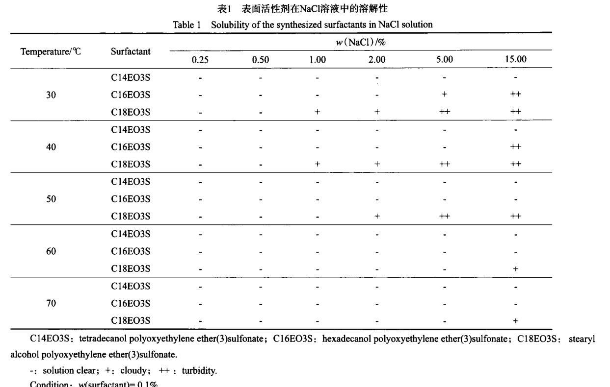 表面活性劑在NaCl溶液中的溶解性見表1。從表1可看出,在實(shí)驗(yàn)溫度(30~70℃)內(nèi),C14EO3S在不同NaCl含量的溶液中均具有較好的溶解性;C16EO3S在30℃的5.00%(w)NaCl溶液中出現(xiàn)渾濁現(xiàn)象,但隨溫度的升高,溶解性增強(qiáng);C18EO3S的溶解性較差,當(dāng)溫度為30~40℃時(shí),它在1.00%(w)的NaCl溶液中即開始出現(xiàn)渾濁現(xiàn)象,溶解性隨溫度的升高而逐漸增大,當(dāng)溫度升至60℃后僅在15.00%(w)的NaCl溶液中出現(xiàn)渾濁現(xiàn)象。實(shí)驗(yàn)結(jié)果表明,脂肪醇聚氧乙烯醚(3)磺酸鹽表面活性劑中的脂肪醇碳原子數(shù)越少(碳原子數(shù)小于16),在鹽溶液中的溶解性越好。