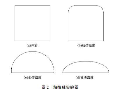 通過對(duì)釉料熔融實(shí)驗(yàn)的觀察可以看到,隨著溫度升高,低共融物產(chǎn)生,試樣出現(xiàn)液相,逐漸變?yōu)槿垠w。四棱柱試樣最先變形的部位為頂部角點(diǎn)。由于角點(diǎn)是四棱柱曲率最大的部位(7/8的表面與空氣接觸),表面張力最大,表面能高,由表面張力產(chǎn)生的指向熔體內(nèi)部的附加壓力也最大,因此角點(diǎn)最先熔融變圓,此時(shí)試樣所處的溫度(1180℃),稱為釉的始熔溫度,釉層開始封閉,如圖2b所示。隨著溫度繼續(xù)升高,四棱柱的棱邊也開始熔融變圓,棱邊也是曲率較大的部位(3/4的表面與空氣接觸)。最后,四棱體的各個(gè)平面開始熔融變圓(1/2的表面與空氣接觸),整個(gè)試樣由于表面張力的作用變?yōu)榘肭驙睿藭r(shí)的溫度(1260℃)稱為全熔溫度,如圖2c所示,形成平整、光滑的釉面。釉層雖然處于黏性流動(dòng)狀態(tài),但黏度較大不至于流淌,因此接近于釉的成熟溫度。溫度繼續(xù)升高,試樣流散開來,高度降至原有高度的1/3時(shí)的溫度(1300℃)稱為流動(dòng)溫度,見圖2d。此時(shí)由于溫度升高,熔體表面張力減小,同時(shí)釉熔體黏度降低,受重力作用熔體會(huì)產(chǎn)生自然流淌,熔體表面由球面變?yōu)闄E球面。