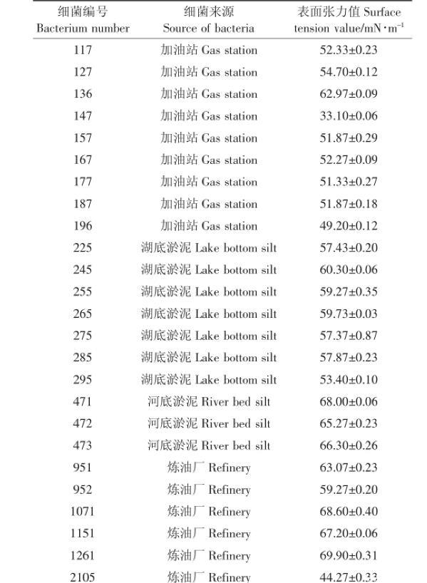 經過血平板初篩得到25株菌株,表1是表面張力儀復篩結果。可以發現147號細菌發酵液的張力值明顯低于其他菌株,選擇147細菌作為目標菌株。
