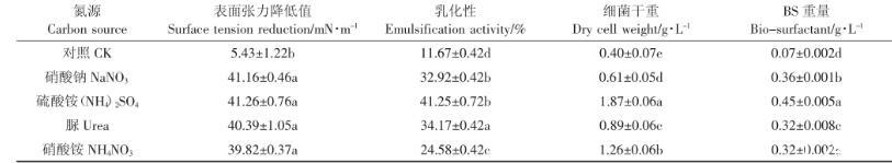 細胞表面的物質合成需要氮源,氮源的種類會對細菌細胞的生長和發酵產物的產量產生很大影響。由表4可以看出,不同氮源對細菌發酵過程中表面張力降低值的影響較小,可能與發酵液中的生物表面活性劑含量已經達臨界膠束濃度(CMC)有關。當氮源為硫酸銨時發酵液表面張力降低值最大,同時乳化性、細菌干重、糖脂含量均達到最大值。這與錢曉勇等研究結果一致,硫酸銨是促進生物表面活性劑生成的較好氮源。