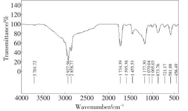 將菌株147產物提純,紅外光譜儀(FT-IR)分析物質結構,結果如圖2。該物質在3701.72cm-1處有吸收峰,表明分子中有羥基存在;2 858.77~2 927.56 cm-1處的吸收峰表明存在糖類C-H的伸縮振動,1400~1200 cm-1處是C-H變角振動,1 734.39 cm-1處是C=O的雙鍵振動,而1 070.04 cm-1處為C-O-C鍵伸縮振動,因此該物質中有一個五元環狀內酯和糖苷鍵存在。由此進一步證明該生物表面活性劑含糖脂類物質。
