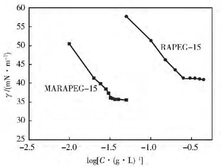 圖2是MARAPEG-15和RAPEG-15的表面張力(γ)和濃度(C)的關系。表1是MARAPEG-15和RAPEG-15的表面性能。